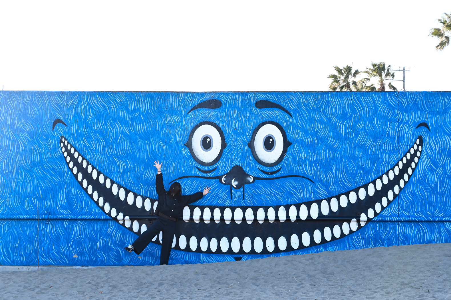 青い毛むくじゃらのモンスターの裏側に描かれたアート。