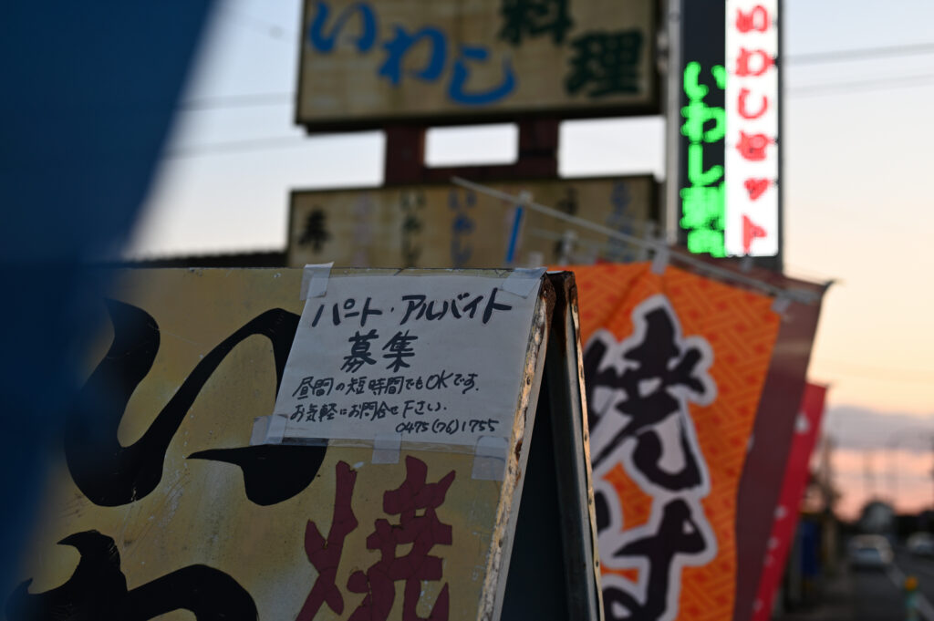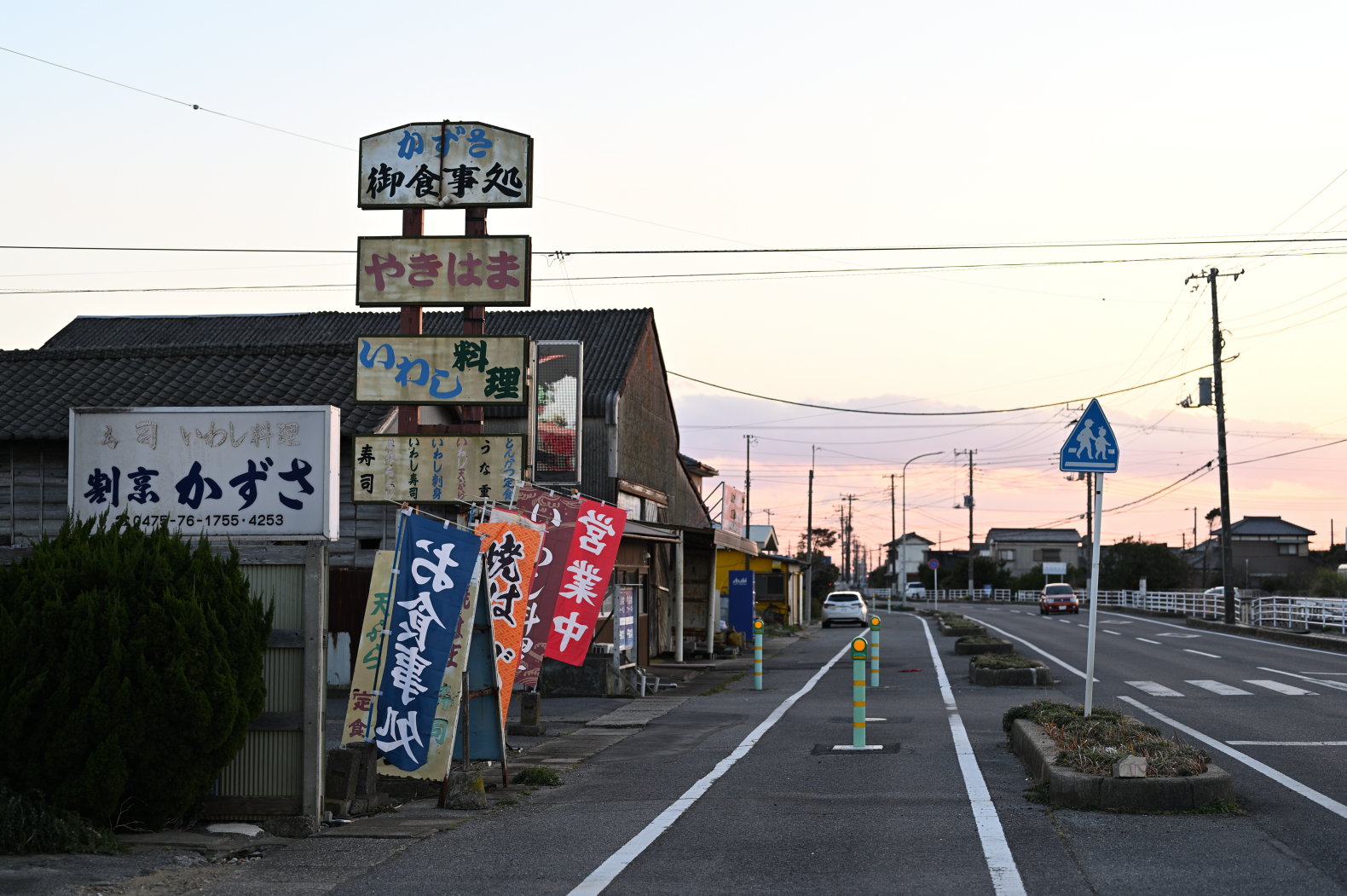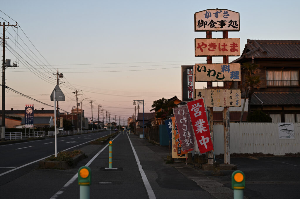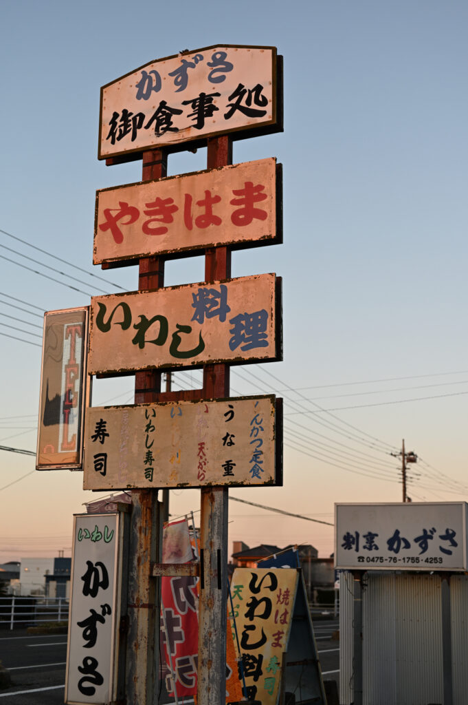 千葉県道30号飯岡一宮線=九十九里ビーチライン沿いに立地している店舗。海の幸の連想させるワードがずらりと並ぶ。