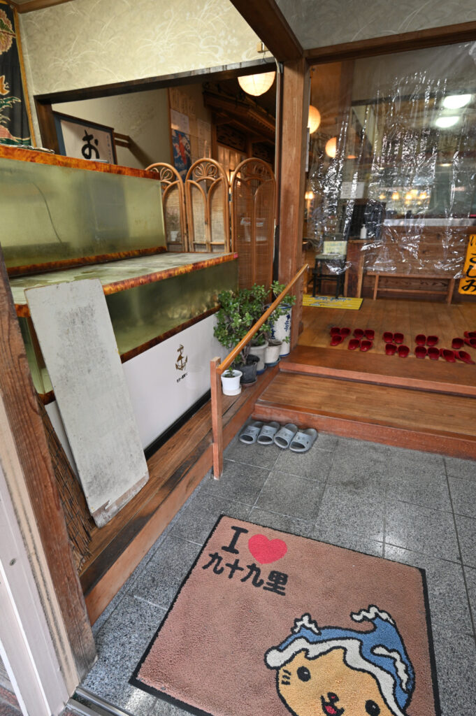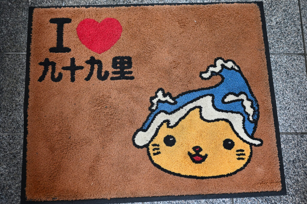 「I♡九十九里」のマットがお出迎えする。描かれているのはご当地キャラの「くくりん」。