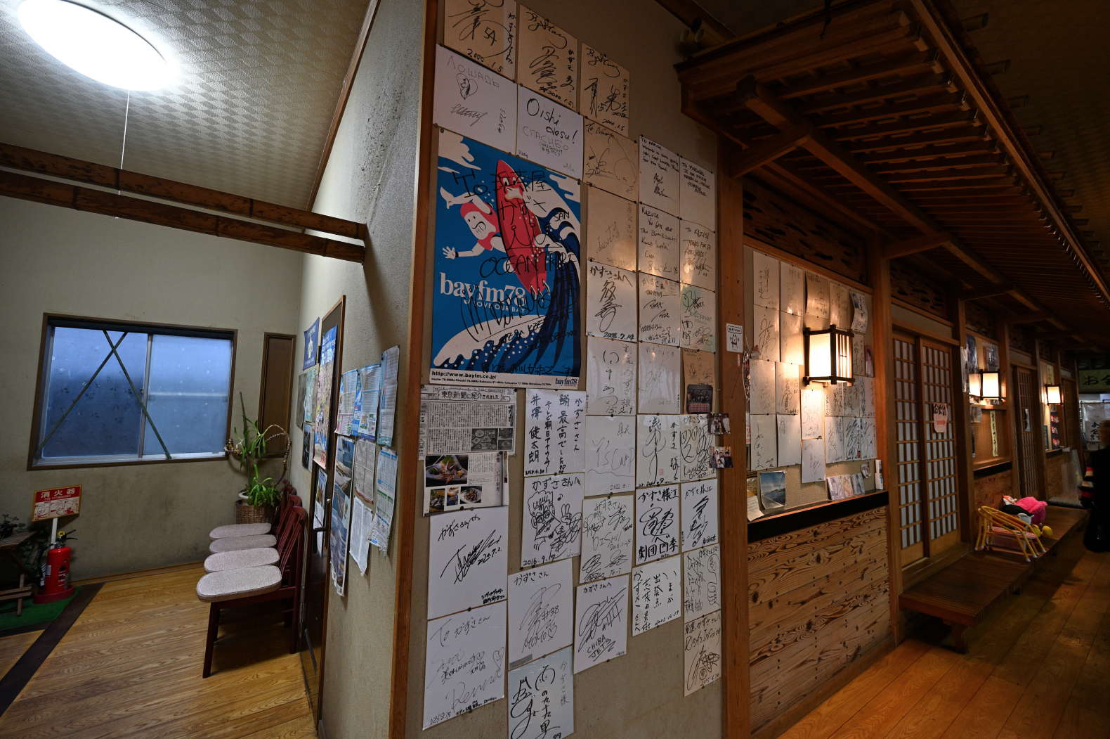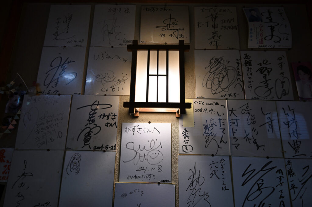 さらに廊下を奥へと進むと再びサインの壁が。芸能関係者の方も多く訪問されているらしい。