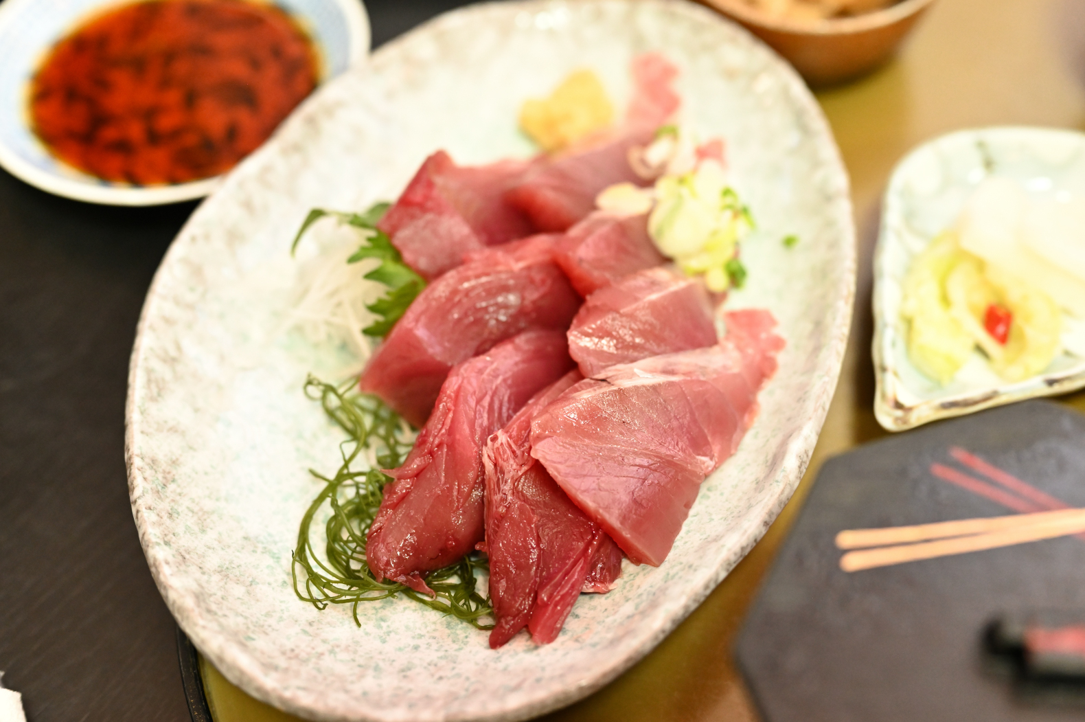 ・カツオの刺身+ライス、お新香、だんご汁セット