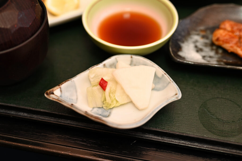 定食に付属のお新香。貝殻の形のお皿が可愛い。