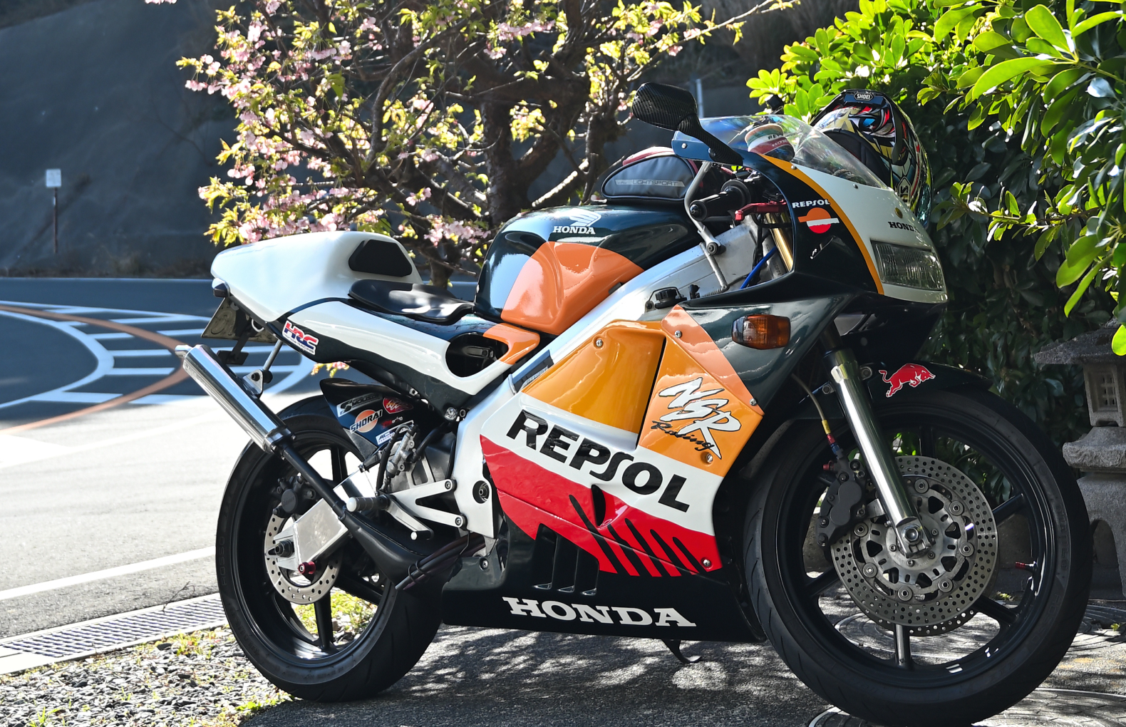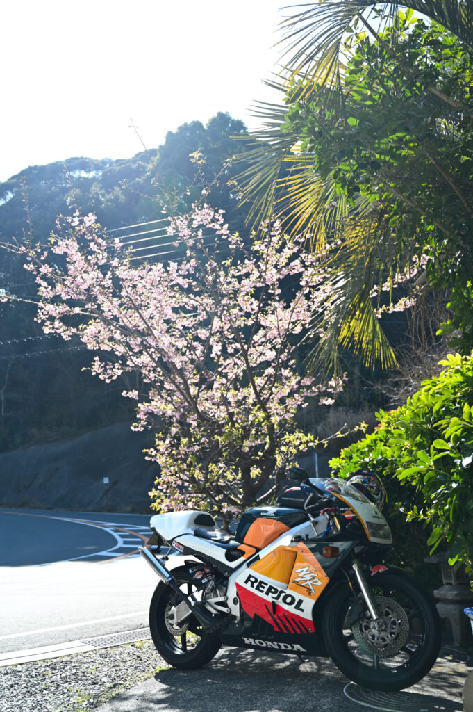 静岡県道16号下田石廊松崎線沿いに立地している「御休み処 見須」。店舗入り口にHONDA NSR250Rが停まっていた。しかもレプソルカラー。輝く桜の木と南伊豆の空気感とあわせて印象的だった。