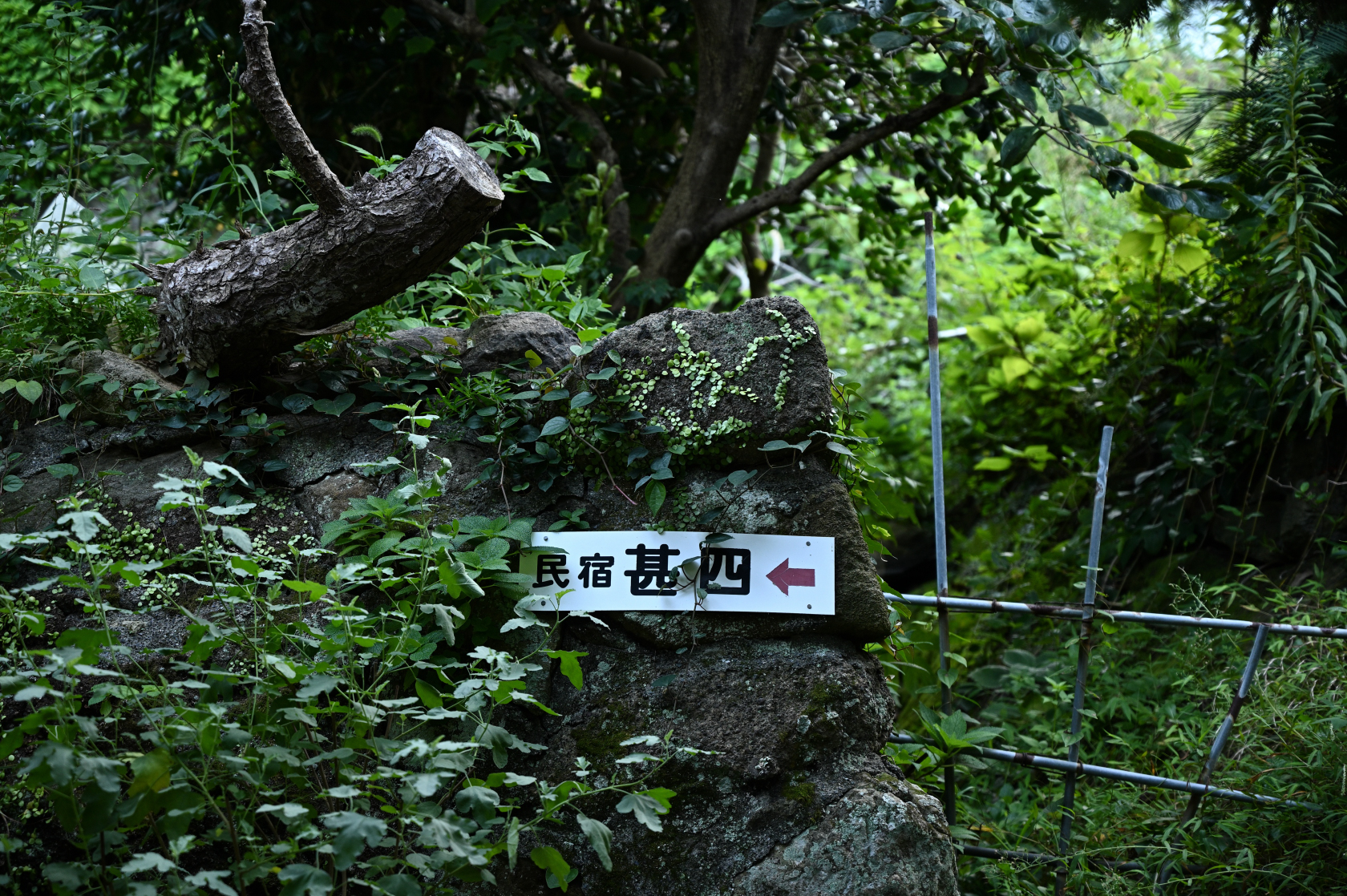 朝7時頃の民宿甚四の入り口付近。甚四の案内板の上に小さな丸の葉をつけているのはマメヅタ。意外にもビカクシダ(別名:コウモリラン)などと同じウラボシ科の植物。伊豆の湿気のある場所の木にマメヅタが這っているのをよく見かける。