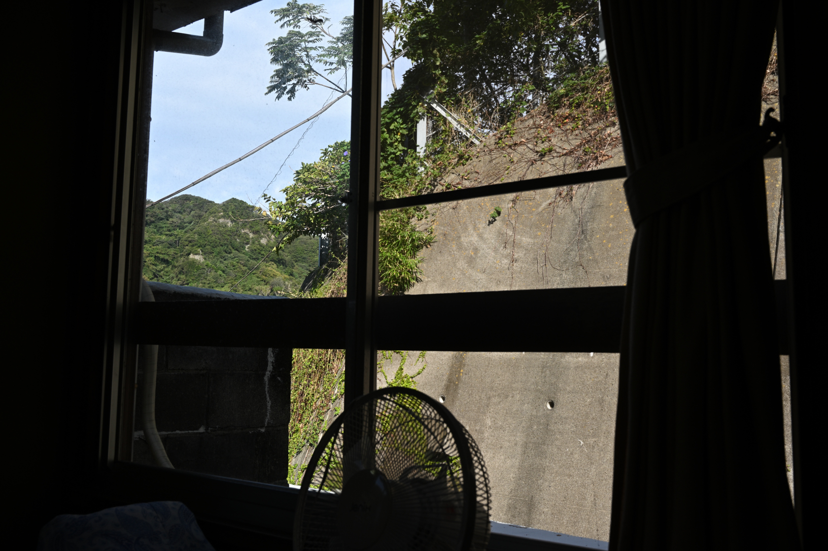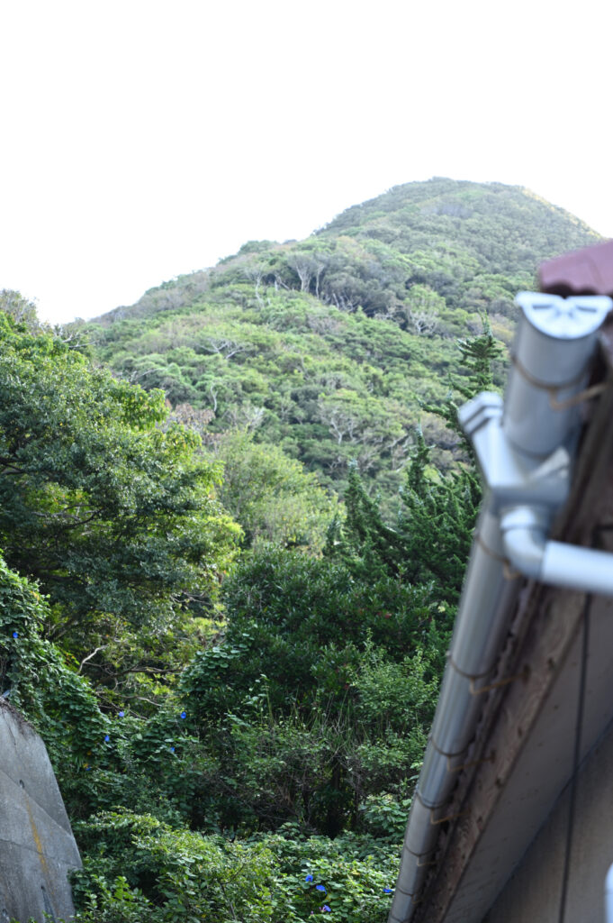 2Fテラスから建物越しに振り返ってみると、山が聳え立っていた。