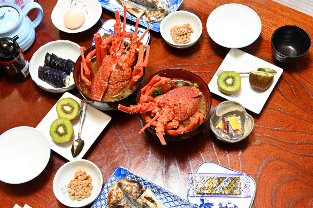 前日の特別料理のイセエビを味噌汁に入れてくれるスペシャル朝ごはん定食。