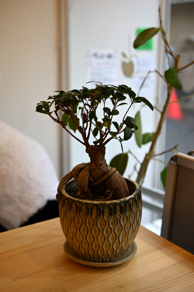 陶器鉢に入れられたガジュマル。家のなかで盆栽のように育てられる人気の観葉植物。特に幹が見ごたえがある。