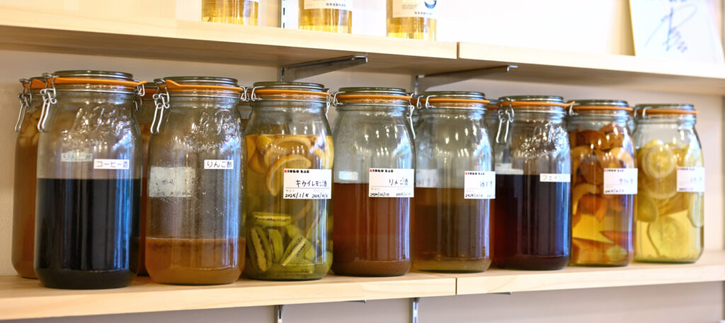 カウンターの棚には自家製のフルーツ酒が並んでいた。