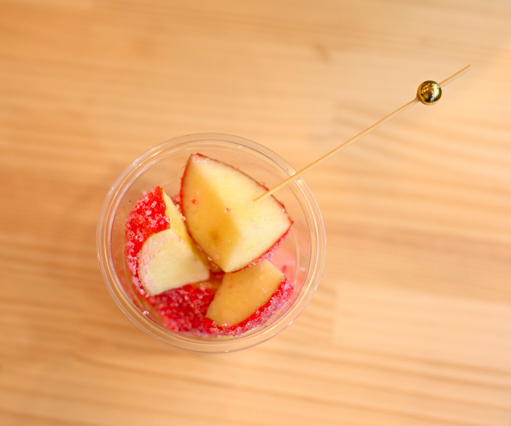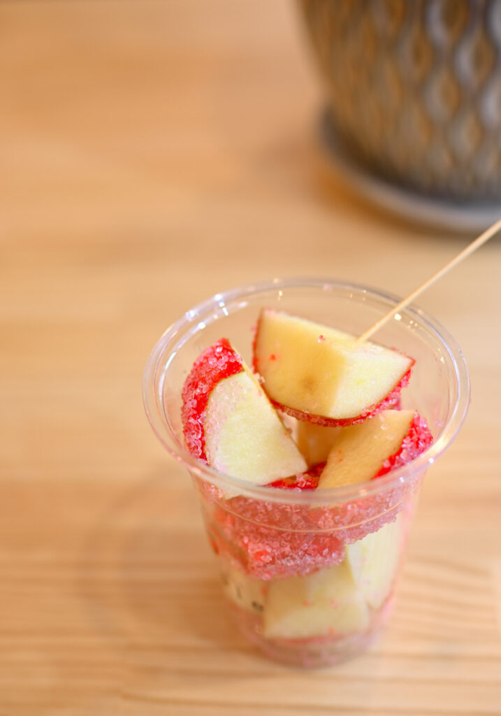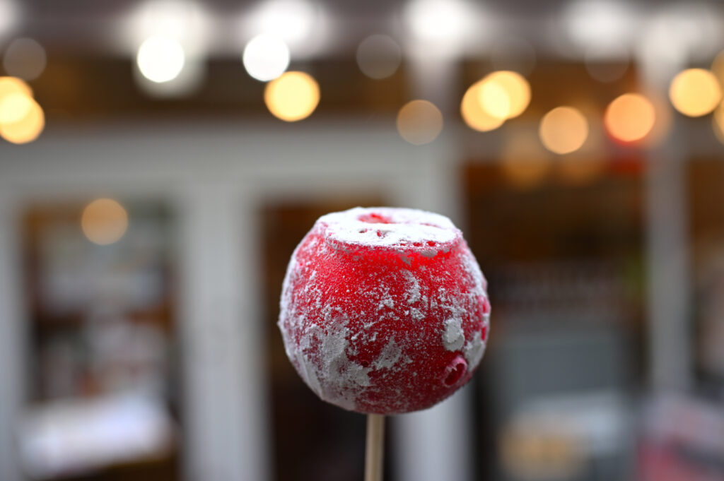 私はシナモン味にしてみた。これぞザ・リンゴ飴。リンゴの甘味とシナモンの風味を強く感じて美味しい。外殻の飴の部分の薄くパリパリとした食感も新鮮だった。