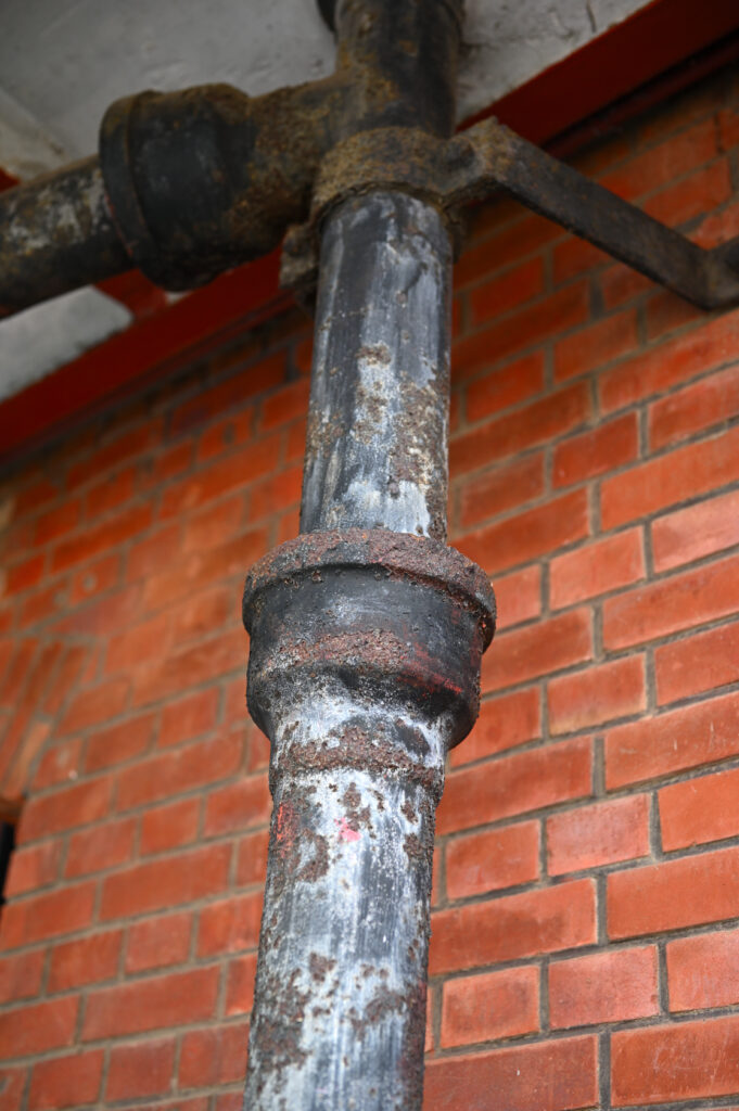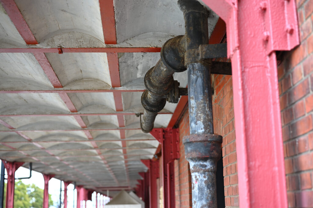 きちんと塗装処理された柱と違い経年を感じる管。用途は何であろうか。雨樋であろうか。