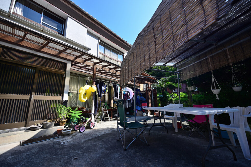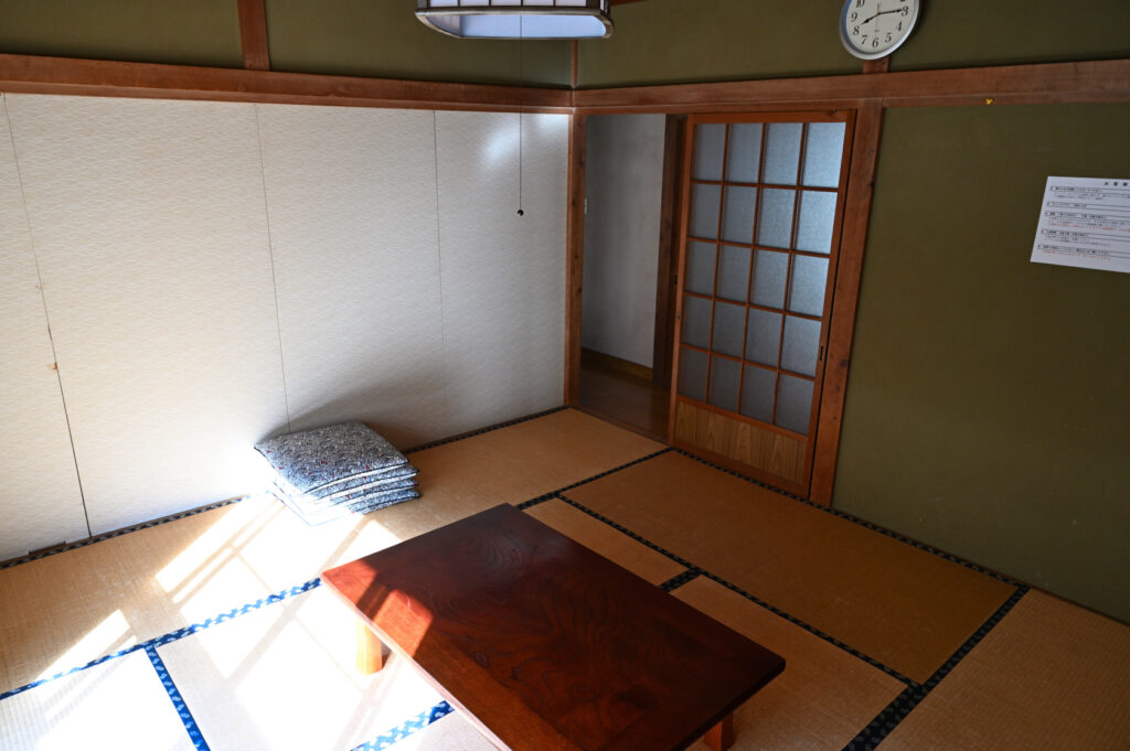 左の扉が正面玄関入口。右側のテーブルが休憩&喫煙所スペース。干し場にもなっている。