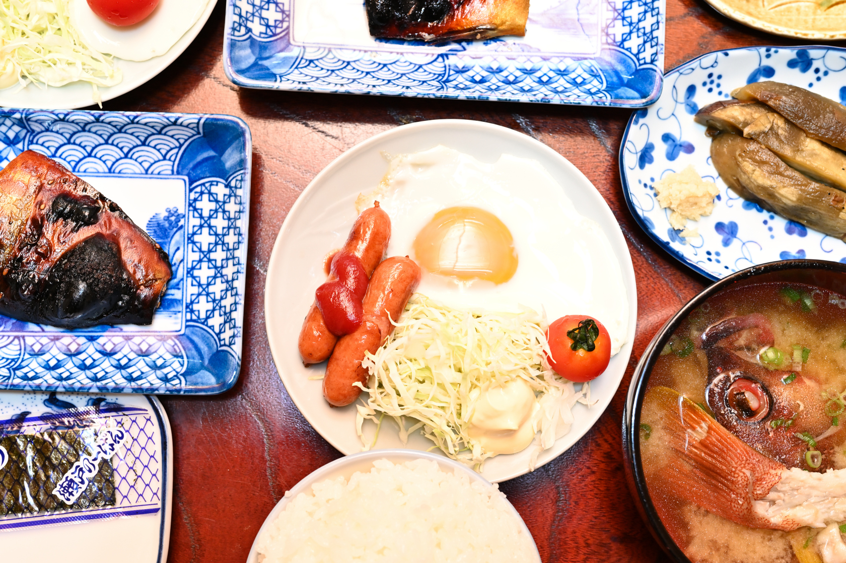 炊き立て白米、海苔、焼き魚、目玉焼き、ウィンナー、サラダ、ナス料理、明太子、お新香、沢庵、漬物、そしてアカハタの味噌汁。