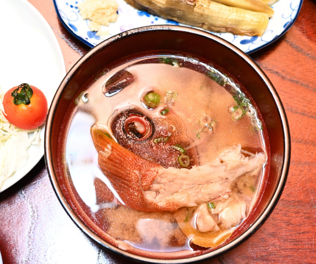 アカハタの味噌汁。ヒリゾ浜では至る所で見かける魚種。食べると至高の味がする。アカハタを出汁にした味噌汁の風味は、間違いなく天国へと連れて行ってくれる。ライス⇔味噌汁の往復が無限にできてしまう。
