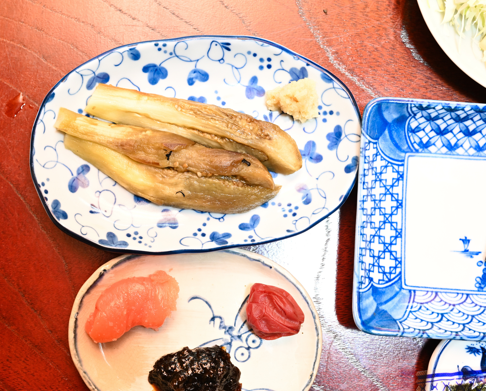ナスと生姜の組み合わせも最高。箸が止まらない。梅干し&明太子&海苔の佃煮の塩分コンボも一日泳ぐぞ!と思わせてくれる至高の組み合わせだ。感謝。