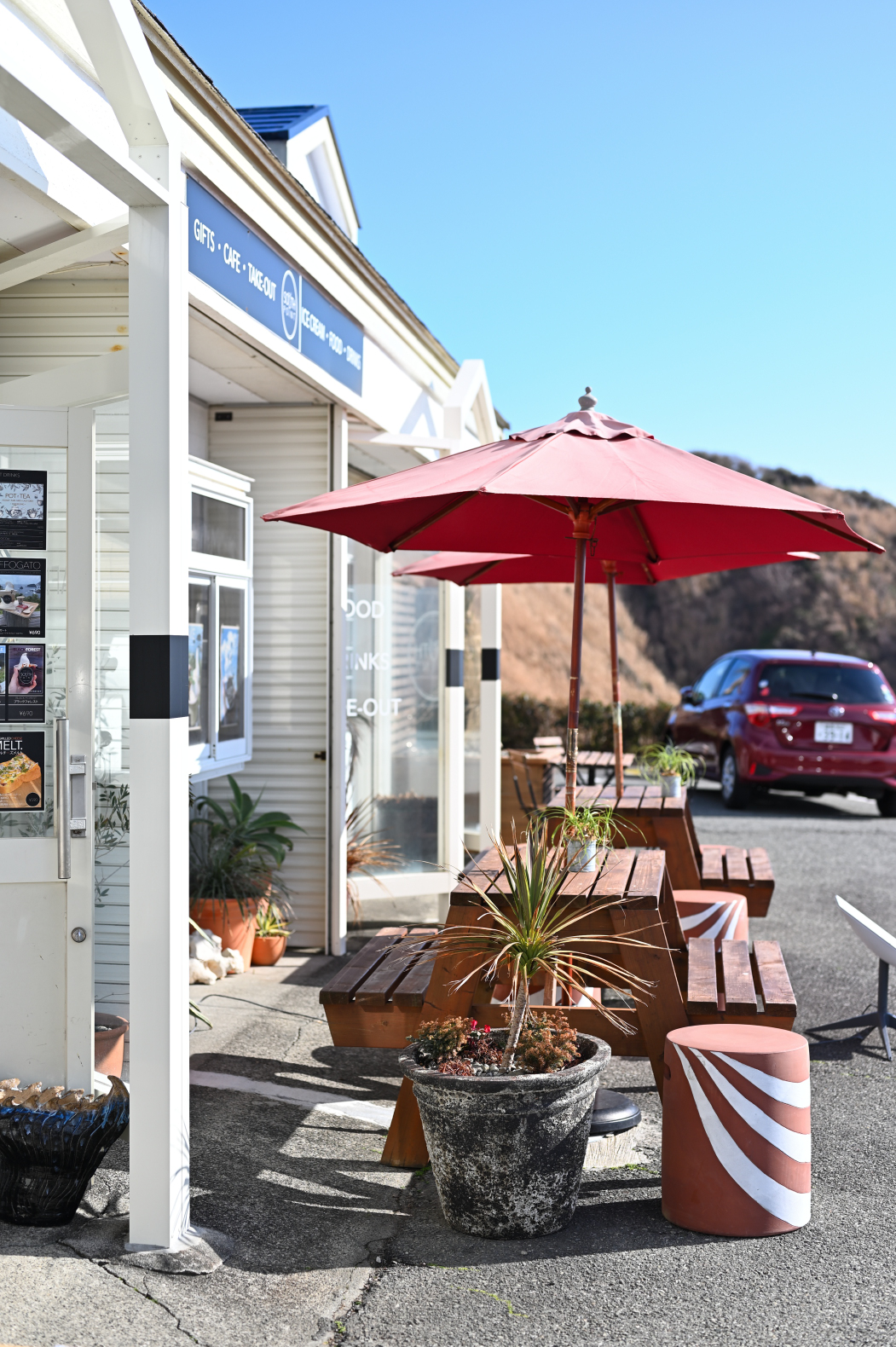 店内にイートインスペースもあるが、店舗前にもパラソルの休憩所が設置してある。春の陽ざしを浴びながらカフェしたい気持ちになった。