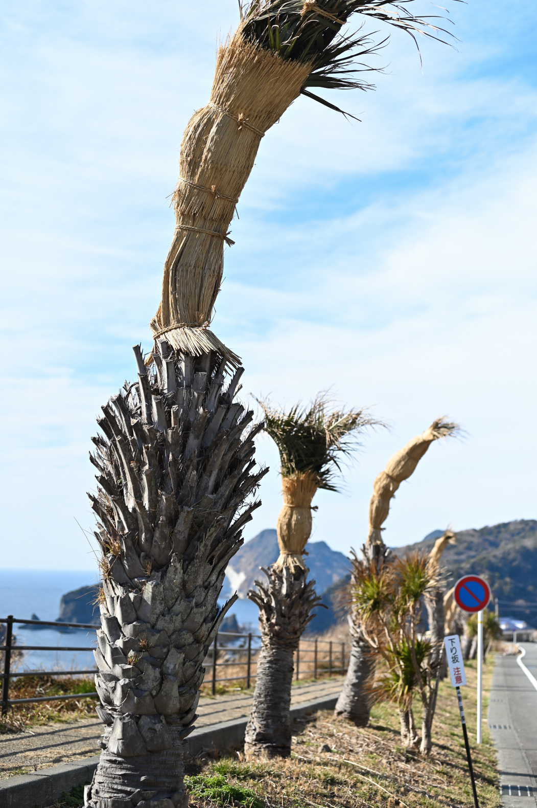 冬の南伊豆の風物詩。冬の季節風の影響(おもに塩害)から守るために「こも掛け」されたヤシの木々。