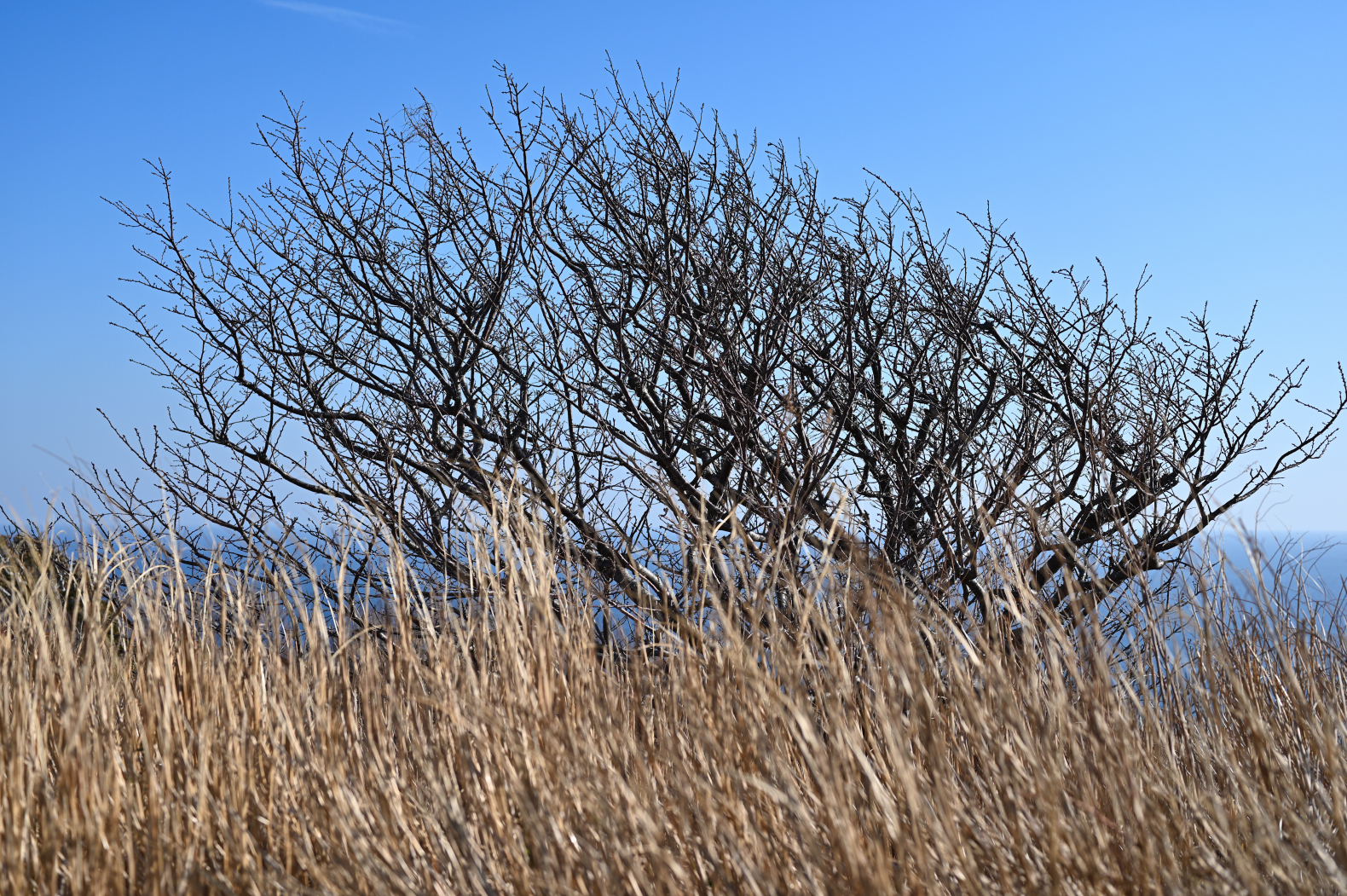 風衝樹形(ふうしょうじゅけい)と呼ばれる、風の影響を受けた樹木。桜の木も海から陸方向へと曲がっているように見えた。